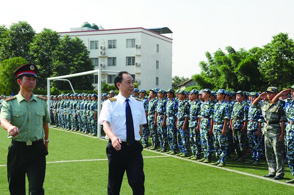 郑孝雍在军训基地领导董小平的陪同下检阅新生方队
