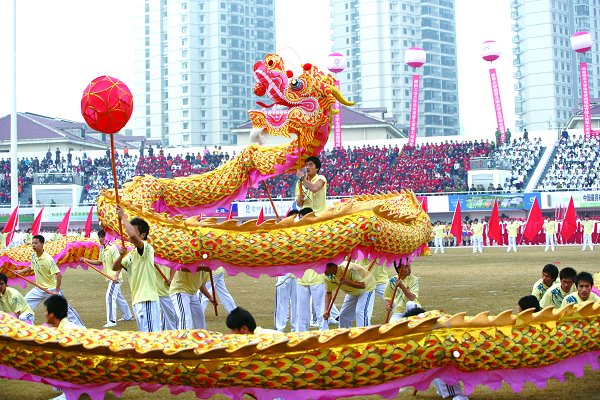 开幕式的重头戏———大型文体诗画《阳光·梦想》,包括《牵手湘江》、《同学少年》、《阳光花雨》和《放飞梦想》四大版块,充满了鲜明的湖湘文化特色和明快的校园气息。其中,《牵手湘江》表现的是中南林喜迎四方健儿,潇湘学子齐欢聚,牵手湘江颂中华的主题。节目一开场,480面绿波绸舞得波浪翻滚,演绎出湘江北去的浩荡声势。随后,100名健壮小伙儿在统一的号令下扬起大浆,瞬间绿波上蛟龙出水,龙舟竞发!200位手执水绿飘带、身着粉色纱裙的水姑娘飘逸地汇入舞台翩翩起舞,唱响“绿色恋歌”。在粼粼波光中,100只巨型风车旋转,全场呈现出一派潇湘云水胜景。《阳光花雨》版块则将力的韵律、操的健美、花的绚丽有机融合,勾勒出幅幅充满朝气的画面,让人感受到阳光体育的无限魅力。由88条湖蓝色绸带汇成的“游泳池”里,“波涛”和着音乐“汹涌”,游泳健儿飞舞着手臂在碧波中时隐时现,动作整齐划一,如同一群群海鸥展翅翱翔……我校4000多名学生历经两个多月的艰辛排练,终于在开幕式上奉献了一场精彩的演出,充分展示了中南林学子的青春风采。