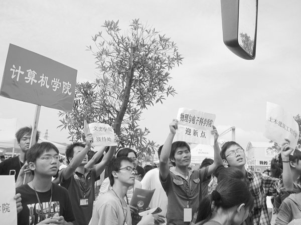 9月11日上午,平日里安静宁谧的校园突然变得喧闹起来,篮球场上各学院的迎新工作正在如火如荼地进行。新生们在学长学姐们的帮助下从容地办着入学手续,志愿者们不顾辛劳在炎炎烈日下奔波穿梭,老师们也亲临现场,为学生们、家长们答疑解惑。