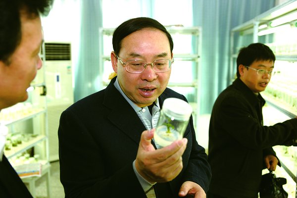 在经济林育种与栽培重点实验室,梅克保拿起刚刚长出来的组培苗仔细端详。
