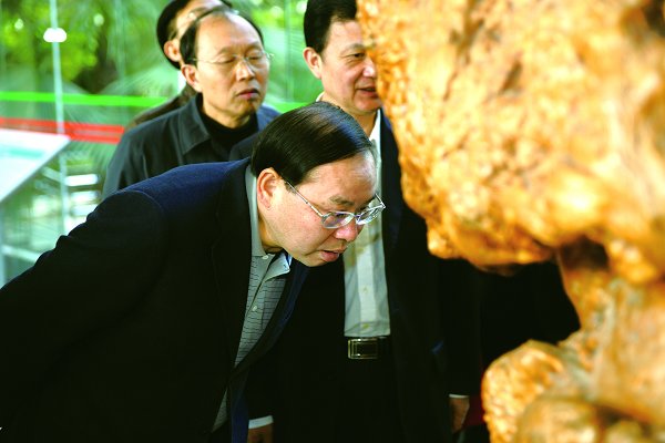 摆放在生科楼大厅里的天干果树榴引起了梅克保浓厚的兴趣。