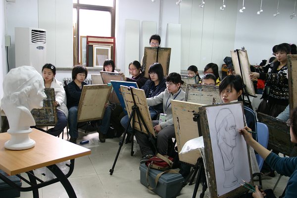 艺术系的教学区位于学校主楼北的五层,一个相对独立而安静,充满着中国传统艺术气息的所在:走廊两侧的橱窗内尽是笔墨丹青,那是同学们写生的习作和各类美术展的海报;走廊上方悬挂着一盏盏图章造型的灯,古朴雅致。推开以红色篆刻为装饰的古铜色门,教室也是画室,摆放着各种画具,同学们各自守着自己的位子,或伏案临摹,或埋头篆刻。任课老师在教室内穿梭,不时为学生提出指导意见。笔者眼前所见即是艺术系同学上课习作的情景。