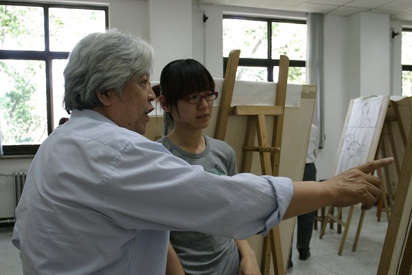 学生的成长与老师们的悉心指导密不可分。名师出高徒,中国书画专业的老师们大多兼具教师和画家两重身份,在书画界颇有知名度,既有深厚的艺术理论修养,又有着骄人的艺术创作成绩。老一辈的有马振声、金亭亭、张占一等,中青年教师中有齐鸣、刘山花、朱天曙、王杨、尹成君、张宇辉等。马振声先生师承现代水墨人物画一代宗师蒋兆和,现为中国美术家协会会员,国家一级美术师,作品以水墨人物为主,1994年他受聘为北语艺术系系主任、教授,为本科生开设了“中国水墨人物创作与研究”等课程,并指导研究生的艺术创作和论文写作。他以自己的创作实力和人格魅力感染着年轻后辈,也扩大了艺术系的影响力。在他的倡导下,蒋兆和艺术研究会于2007年落户北语,其宗旨为整理、研究蒋兆和的思想理论,继承和发扬蒋兆和的艺术精神,推动我国人物画创作的繁荣,扩大蒋兆和学派及其艺术成就。研究会的成立有助于推进艺术系科研、教学的进步和创作水平的提高。朱天曙副教授是全国“七十年代书家”的代表人物之一,他学艺双修,兼书法、篆刻、绘画之长,兼艺术创作和学术研究之长。任教北语以来,他所开设的中国书法(篆刻)创作与研究、中国书法篆刻史、中国古代书论等课程带领学生们进入了中国书法篆刻的精妙世界。今年11月,朱天曙任所长的中国书法篆刻研究所在北语成立,这是艺术系重视学术研究和文化传承的又一盛举。